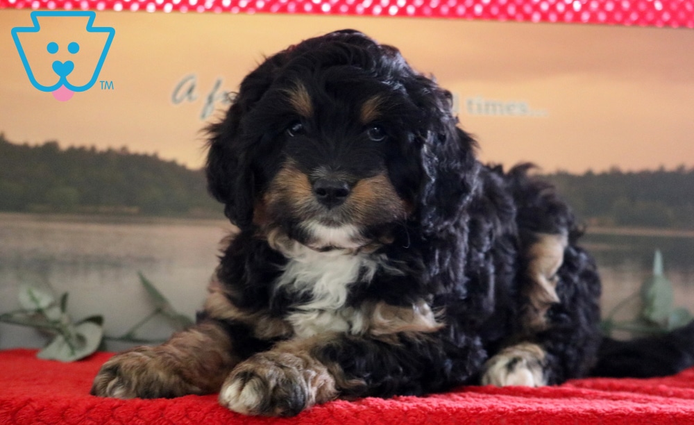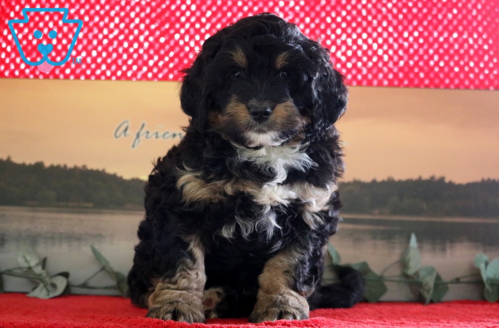 Prince is a charming Mini Bernedoodle with a heart as big as his fluffy paws. Friendly and outgoing, he absolutely loves being around people—especially kids! He is vet checked, vaccinated, wormed, plus the breeder provides a 1 year genetic health guarantee. His momma is a Mini Bernedoodle (Rosie – 28lbs.) & daddy is a Mini Bernedoodle (Checkers – 38lbs.). Prince is always eager to make new friends and share his joyful energy with everyone he meets.