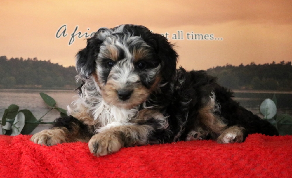 Scotty is a gorgeous Mini Bernedoodle with an outgoing, happy-go-lucky personality. He’s super social, adores being around people, and absolutely loves playing with kids. This cutie pie is vet checked, vaccinated, wormed, plus the breeder provides a 1 year genetic health guarantee. His momma is a Mini Bernedoodle (Darla – 18lbs.) & daddy is a Mini Bernedoodle (Checkers – 38lbs.). Scotty is the perfect mix of fun and affection for a family home.