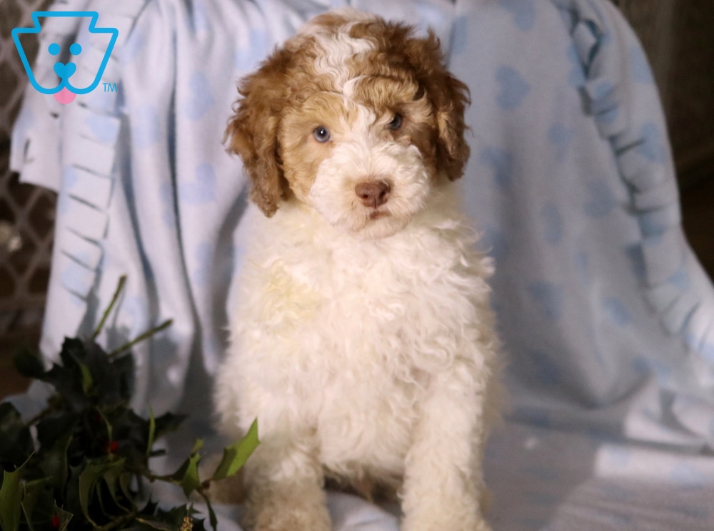 Dunkin is a gorgeous Mini Poodle with Blue Eyes and a personality as bright as his curly coat. Full of confidence and charm, he greets everyone like an old friend and never misses a chance to make a new one. Super social by nature, Dunkin thrives in the company of people—especially kids. He is vet checked, vaccinated, wormed, plus the breeder provides a 1 year genetic health guarantee. His parents are Teresa (25lbs.) & Skippy (11lbs.). A true sweetheart with a playful sparkle, he’s the kind of dog that instantly steals hearts.