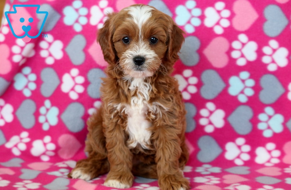 Purdy is a loving Cavapoo with a heart as big as her adorable curls. She’s super social and instantly makes friends wherever she goes — people, pets, and especially kids! This sweet girl is vet checked, vaccinated, wormed, plus the breeder provides a 1 year genetic health guarantee. Her momma is a Cavalier (Lassie – 11lbs.) & daddy is a Mini Poodle (Rodger – 15lbs.). Purdy spreads joy and love everywhere she goes.