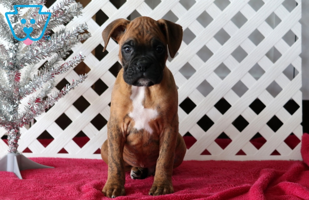 Dawson is a stunning Boxer with a joyful spirit and a love for everyone he meets. He’s incredibly social, always ready to make new friends with his bright eyes and wagging tail. Dawson especially adores playing with kids. This cutie can be AKC registered, he is vet checked, vaccinated, wormed, plus the breeder provides a 1 year genetic health guarantee. His parents are Nellie (50lbs.) & Buddy (65lbs.). His sweet, loyal nature makes him the perfect companion for family fun.