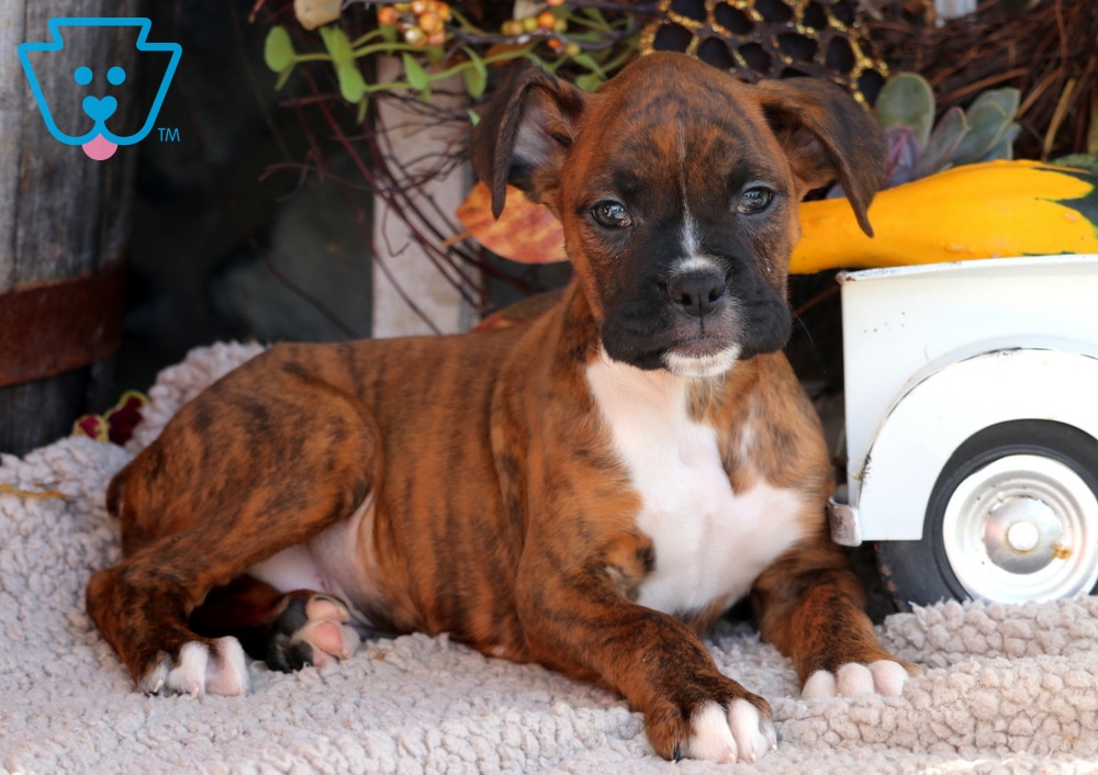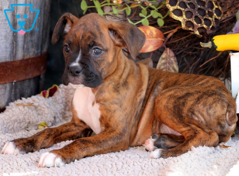 This handsome Boxer pup is full of personality and charm! Dozer is very social and loves spending time with people of all ages, especially kids. He’s well-adjusted, playful, and eager to please. This guy is ACA registered, vet checked, vaccinated, wormed, and comes with a 1 year genetic health guarantee. His parents are Myla (50lbs) & Korey (70lbs). Whether he’s romping around in the yard or snuggling up after playtime, Dozer is sure to bring endless love and laughter to his new forever home.
