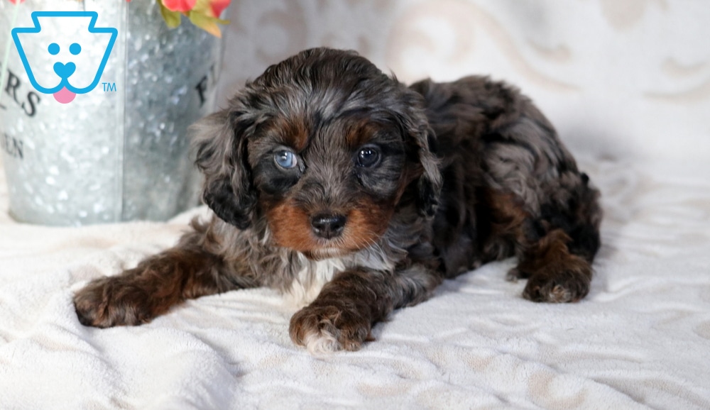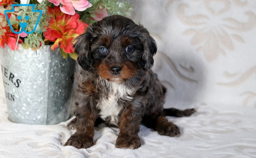 Cookie is a stunning 2nd generation Cavapoo with a heart as big as her playful spirit. This cutie is incredibly social and her favorite moments are spent playing with kids. She is vet checked, vaccinated, wormed, plus the breeder provides a 1 year genetic health guarantee. Her momma is a Cavapoo (Peach – 14lbs.) & daddy is a Black and Brown Mini Poodle (Kolby – 10lbs.). Cookie brings warmth, joy, and a whole lot of charm to every day.