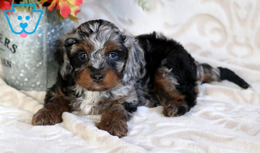 Cutie is a stunning 2nd generation Cavapoo with a heart as big as her playful spirit. This cutie is incredibly social and her favorite moments are spent playing with kids. She is vet checked, vaccinated, wormed, plus the breeder provides a 1 year genetic health guarantee. Her momma is a Cavapoo (Peach – 14lbs.) & daddy is a Black and Brown Mini Poodle (Kolby – 10lbs.). Cutie brings warmth, joy, and a whole lot of charm to every day.