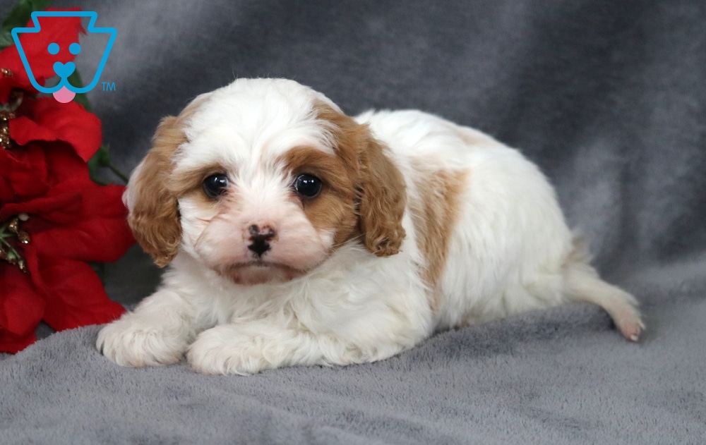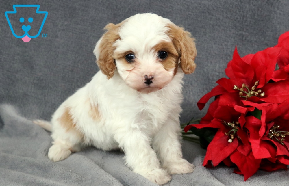 Keyla is a spunky little Cavapoo with a heart as big as her fluffy curls. Always ready for fun, she bounces through life with an irresistible mix of curiosity and charm. She is incredibly social and she absolutely lives for playtime with kids. This little gal is vet checked, vaccinated, wormed, plus the breeder provides a 1 year genetic health guarantee. Her momma is a Cavalier (Sunshine – 20lbs.) & daddy is a Mini Poodle (Hunter – 12lbs.). Keyla brings joy and energy to every moment.