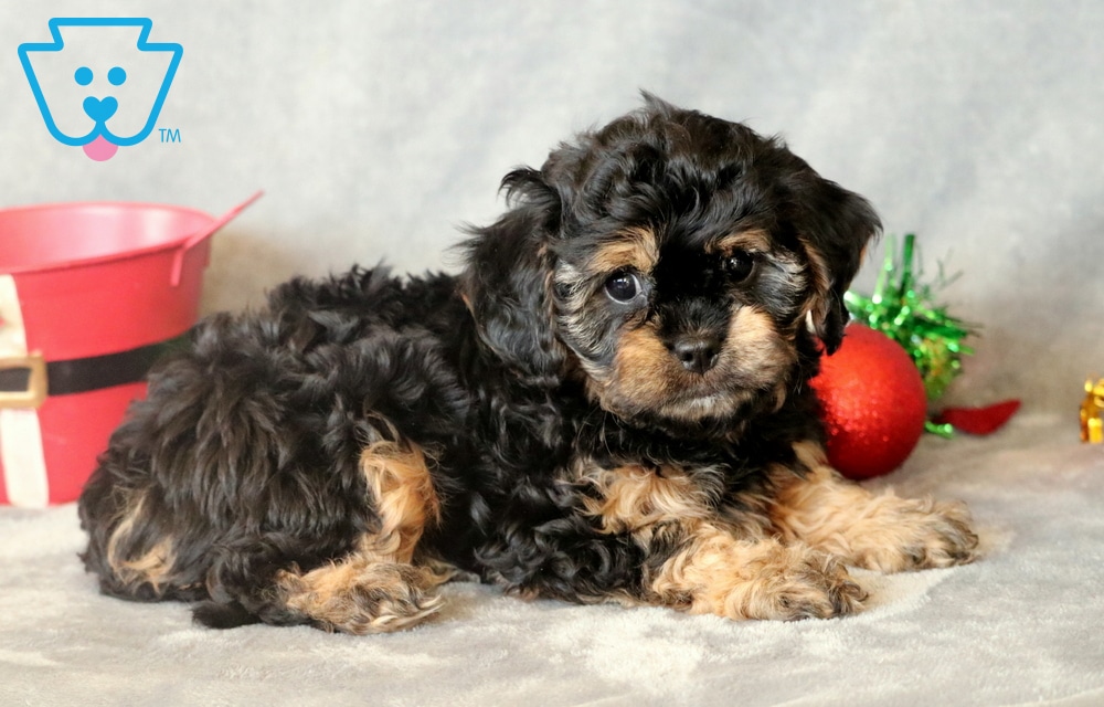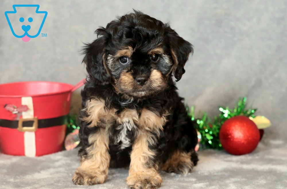 Polly is a sweet and affectionate Cavapoo with a heart as soft as her curls. She adores children and is always ready for playtime. Social by nature, Polly loves meeting new people and furry friends alike. This cutie is vet checked, vaccinated, wormed, plus the breeder provides a 3 year genetic health guarantee. Her momma is a Cavalier (Princess – 20lbs.) & daddy is a Mini Poodle (Asher – 16lbs.). Her gentle temperament, playful spirit, and endless love make her the perfect companion for families.