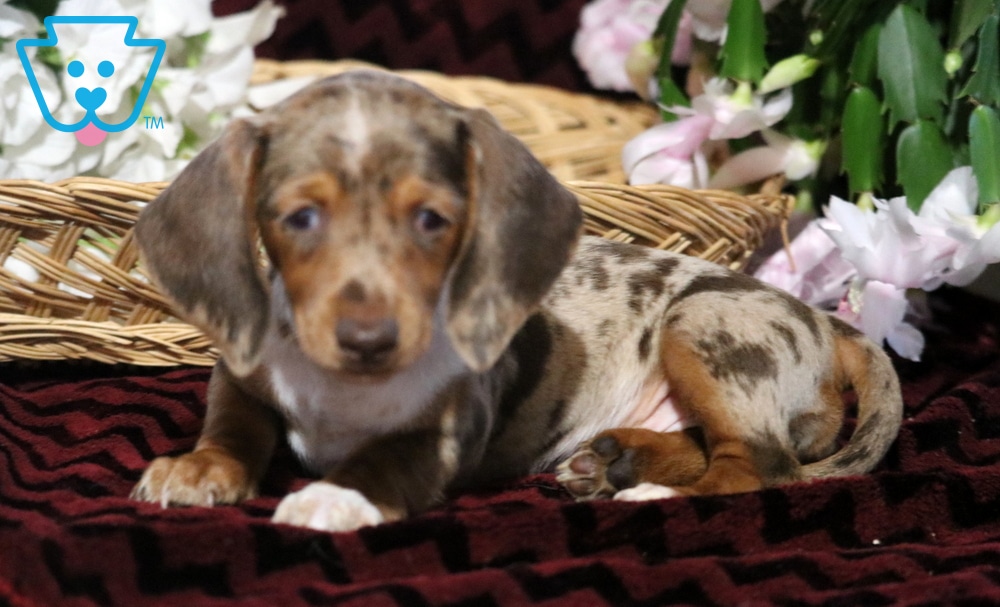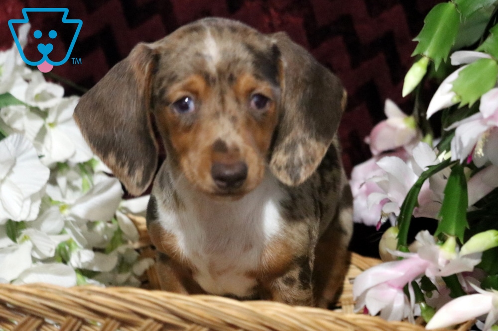 Sidney is a lovely Mini Dachshund with a big heart and an even bigger personality. She’s super social, always ready to make new friends—whether they walk on two legs or four! Sidney adores spending time with kids. She is AKC registered, vet checked, vaccinated, wormed, plus the breeder provides a 1 year genetic health guarantee. Her parents are KJK Lexi (9 1/2lbs.) & Charming Prince (10 1/2lbs.). Her gentle nature, playful spirit, and loving demeanor make her the perfect family companion.