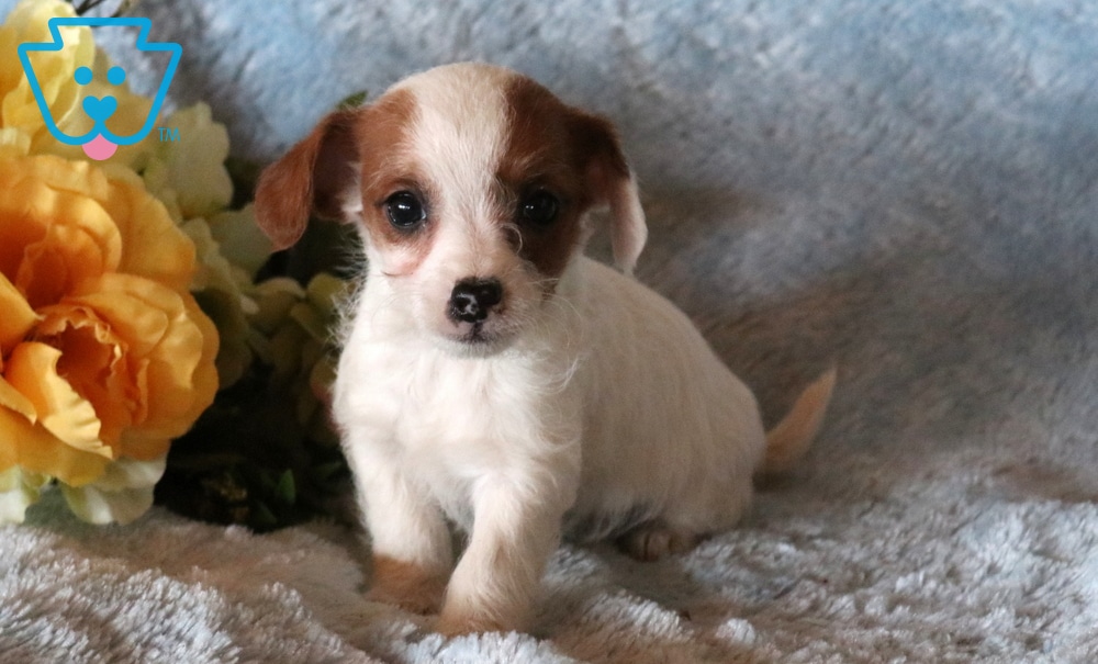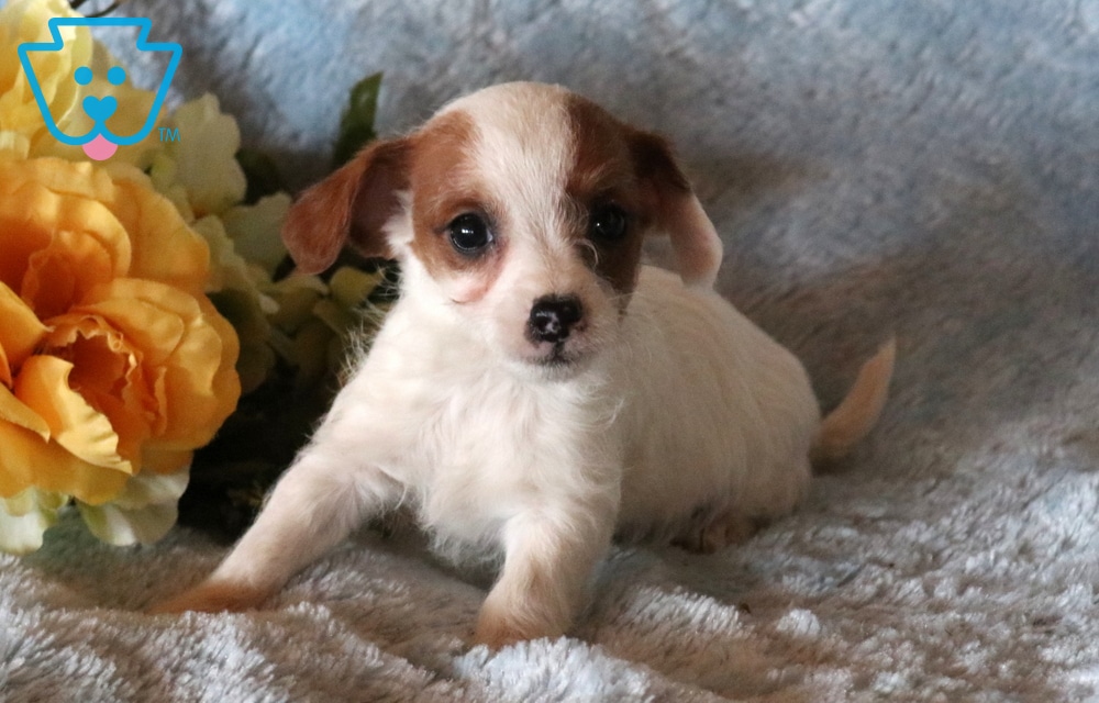 Boston is a lovely Jackapoo with a playful spirit and a big heart. He loves running around and playing with kids, always eager to join in on the fun. This little guy is vaccinated, wormed, plus the breeder provides a 1 year genetic health guarantee. His momma is a Jack Russell (Snuggles – 12lbs.) & daddy is a Mini Poodle. Boston brings laughter, smiles, and endless joy to everyone he meets.