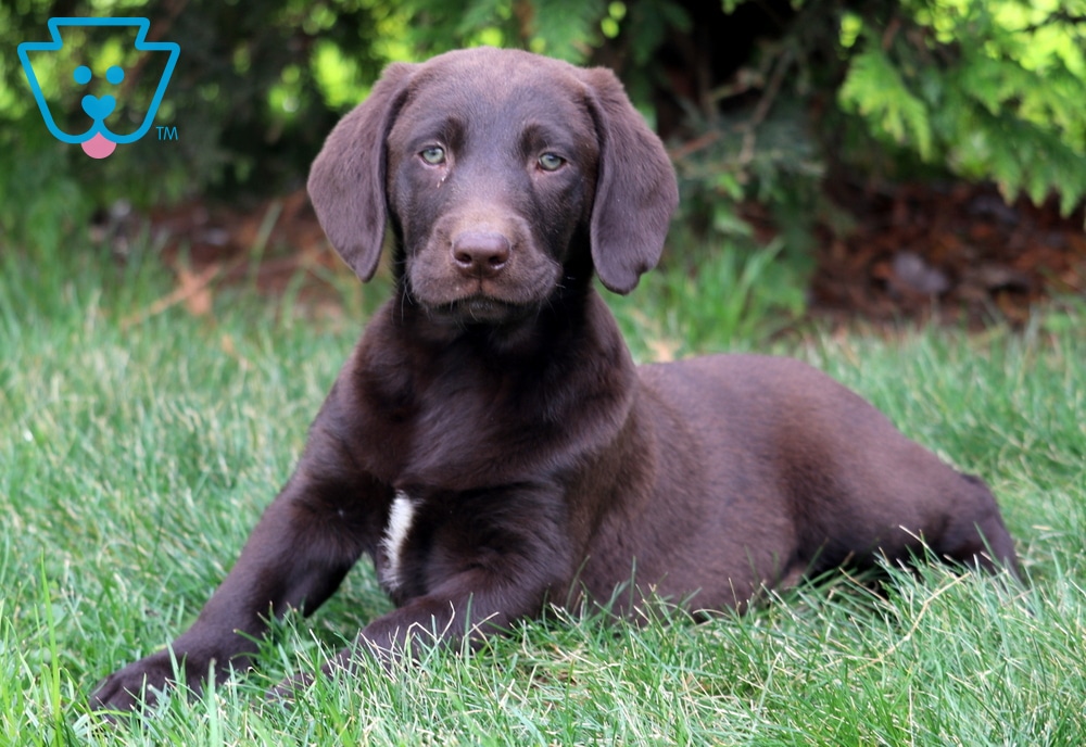 Dice is the kind of Chocolate Lab puppy who makes fast friends wherever he goes. Full of life and tail wags, he has been lovingly raised with kids and thrives on attention, playtime, and being part of the action. This sweet boy is not only social and outgoing, but also eager to please—making him a wonderful fit for families looking for a fun-loving yet devoted companion. He is AKC registered, vet checked, vaccinated, wormed, and comes with a 1 year genetic health guarantee that is provided by the breeder. His parents are Lila Joy (85lbs) & Mosby (95lbs). Dice is ready to fill your home with joy, laughter, and plenty of puppy kisses!