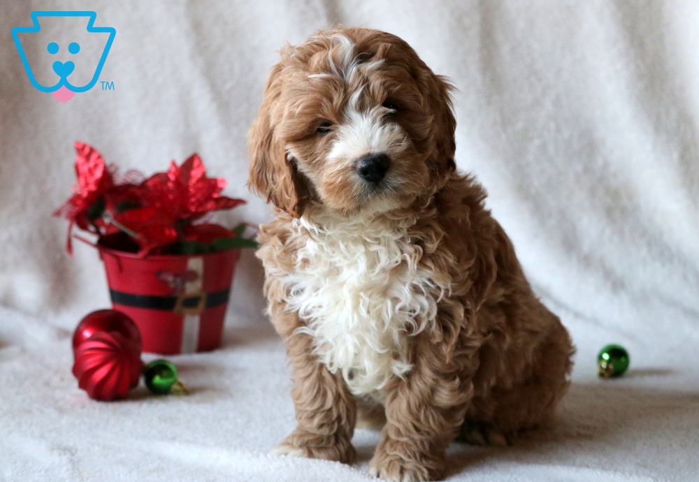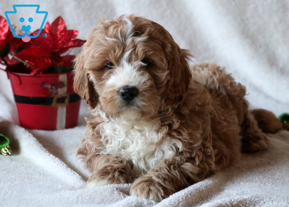 Chip is an adorable Mini Goldendoodle puppy with a heart full of sweetness and a personality that shines! He has been raised around children, so he’s used to love, cuddles, and playtime. This cutie is vet checked, vaccinated, wormed, and comes with a 1 year genetic health guarantee that is provided by the breeder. His parents are Betty (Mini Goldendoodle – 28lbs) & Chief (Mini Poodle – 15lbs). If you are ready to welcome a playful companion & family-friendly puppy into your home, Chip is the perfect fit!