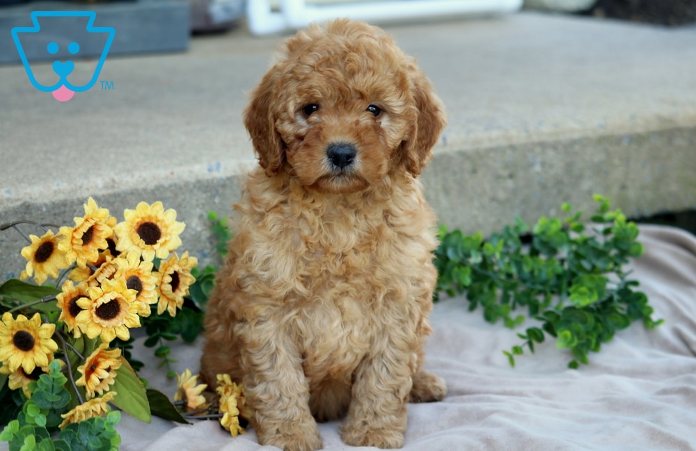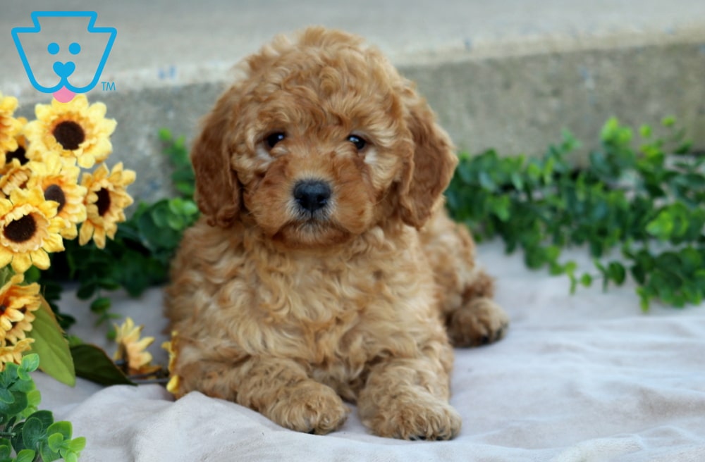 Jasper is a gorgeous Mini Goldendoodle with a soft, curly coat and an even softer heart. This little bundle of joy is a true social butterfly who thrives on making new friends. He absolutely adores playing with children and can turn any backyard into a playground of fun and giggles. This cutie is vet checked, vaccinated, wormed, plus the breeder provides a 1 year genetic health guarantee. His momma is a Mini Goldendoodle (Sandra – 32lbs.) & daddy is a Mini Poodle (Trooper – 16lbs.). Jasper is the perfect companion for families looking for a playful and affectionate pup!
