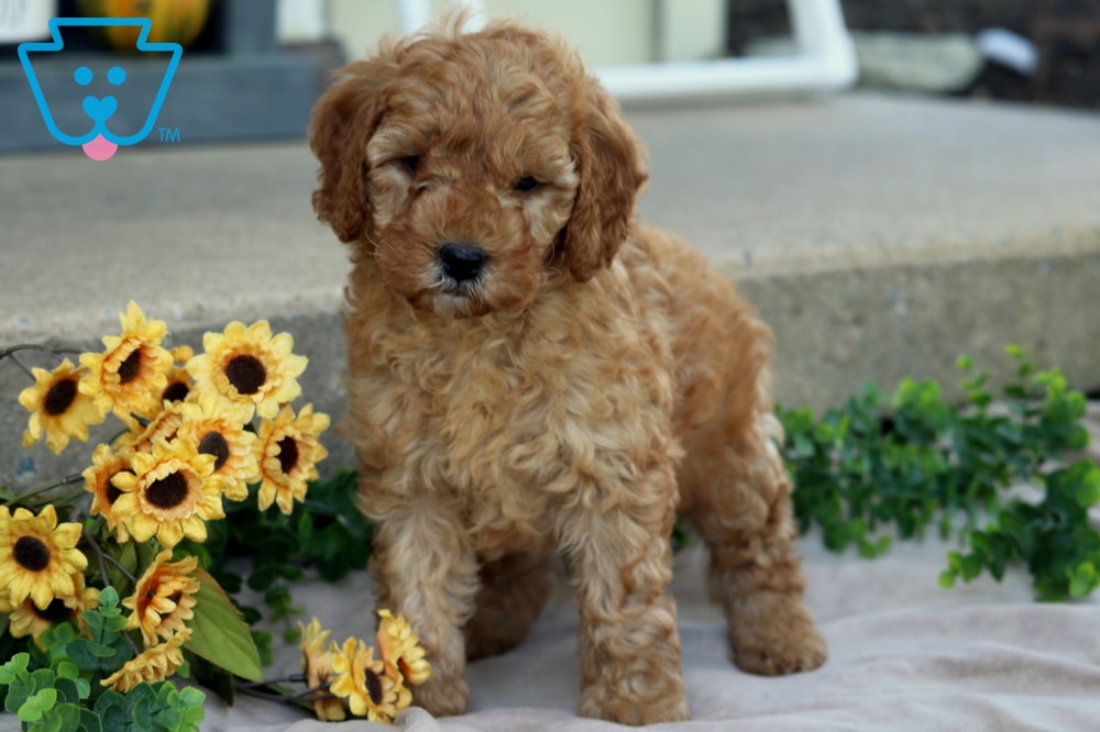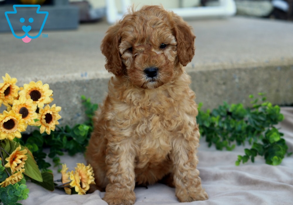 Jet is a gorgeous Mini Goldendoodle with a soft, curly coat and an even softer heart. This little bundle of joy is a true social butterfly who thrives on making new friends. He absolutely adores playing with children and can turn any backyard into a playground of fun and giggles. This cutie is vet checked, vaccinated, wormed, plus the breeder provides a 1 year genetic health guarantee. His momma is a Mini Goldendoodle (Sandra – 32lbs.) & daddy is a Mini Poodle (Trooper – 16lbs.). Jet is the perfect companion for families looking for a playful and affectionate pup!
