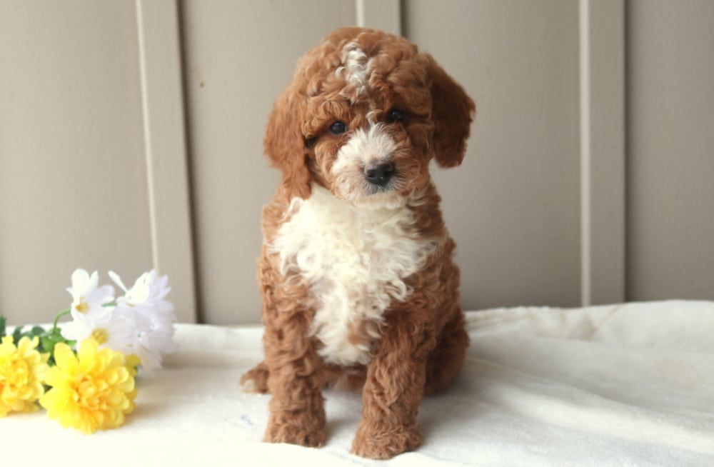 With a playful spirit and a heart full of friendliness, Ruby the Mini Goldendoodle is always ready to make a new friend. She’s incredibly social and especially enjoys spending time with kids. This cutie is vet checked, vaccinated, wormed, plus the breeder provides a 1 year genetic health guarantee. Her momma is a Mini Goldendoodle (Buttercup – 35lbs.) & daddy is a Mini Poodle (Cheif – 15lbs.). Ruby’s cheerful personality and love for people make her a wonderful companion.