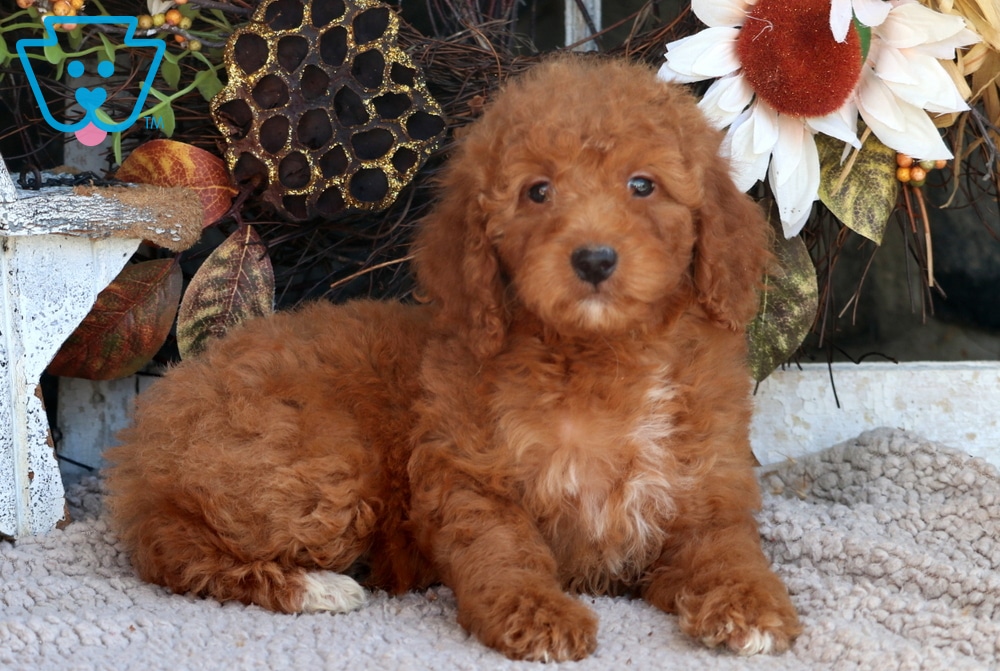 Tabby is a precious Mini Goldendoodle puppy with the happiest personality! She’s incredibly social, loves everyone she meets, and is always ready for playtime or cuddles. This cutie is vet checked, vaccinated, wormed, and comes with a 1 year genetic health guarantee that is provided by the breeder. Her parents are Penny (Mini Goldendoodle – 30lbs) & Jake (Mini Poodle – 12lbs). Tabby has been well-socialized from day one making her the perfect addition to any loving family. Don’t miss out on this Mini Goldendoodle puppy!
