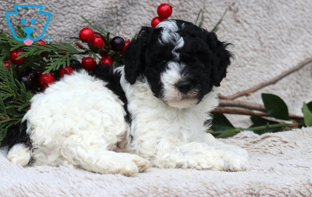 Dodger is a gorgeous Mini Poodle with a personality as bright as his curly coat. Full of confidence and charm, he greets everyone like an old friend and never misses a chance to make a new one. Super social by nature, Dodger thrives in the company of people—especially kids. He is vet checked, vaccinated, wormed, plus the breeder provides a 1 year genetic health guarantee. His parents are Teresa (25lbs.) & Skippy (11lbs.). A true sweetheart with a playful sparkle, he’s the kind of dog that instantly steals hearts.