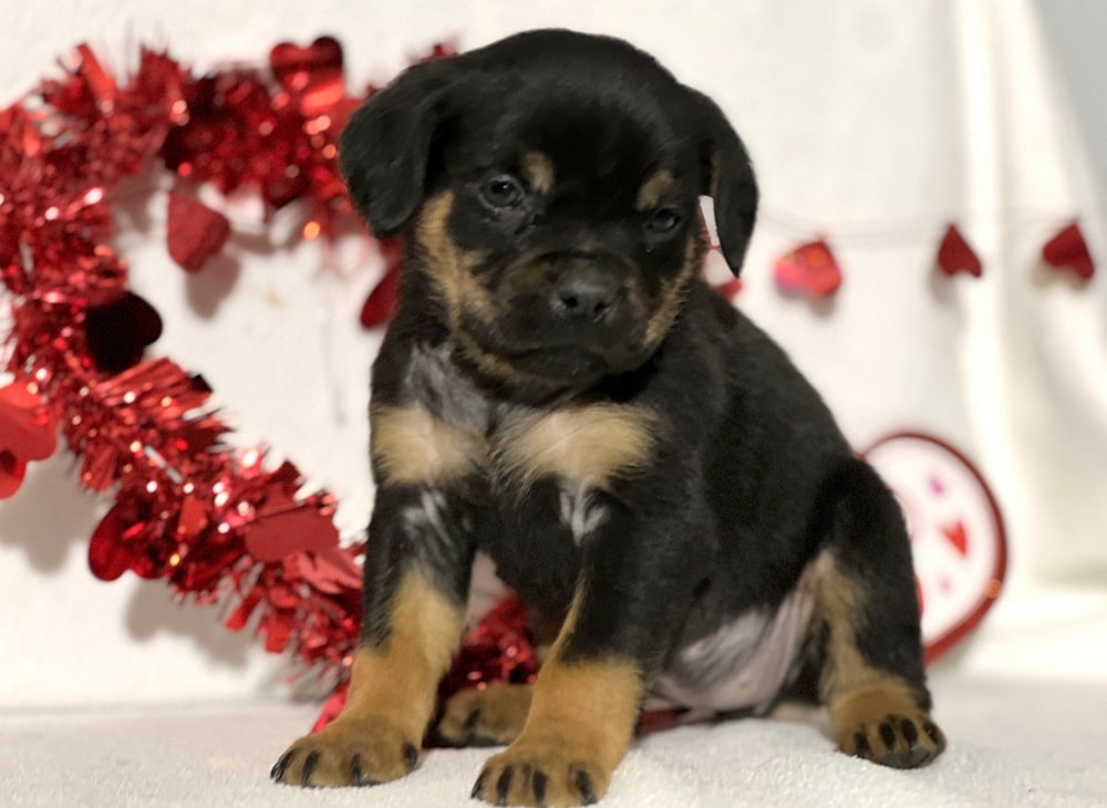 Jacob is an adorable Mini Rottweiler puppy who has been raised with kids and lots of love. He’s very social, enjoys being around people, and has a great demeanor – calm, friendly, and affectionate. Jacob loves attention and is always happy to be part of the action, making him a wonderful choice for a family or anyone looking for a loyal, loving companion. This cutie is ICA registered, vet checked, vaccinated, wormed, and comes with a 1 year genetic health guarantee that is provided by the breeder. His momma is Jackie & daddy is Jury – both Mini Rottweilers. This pooch is ready to bring smiles, fun, and companionship to his forever home.